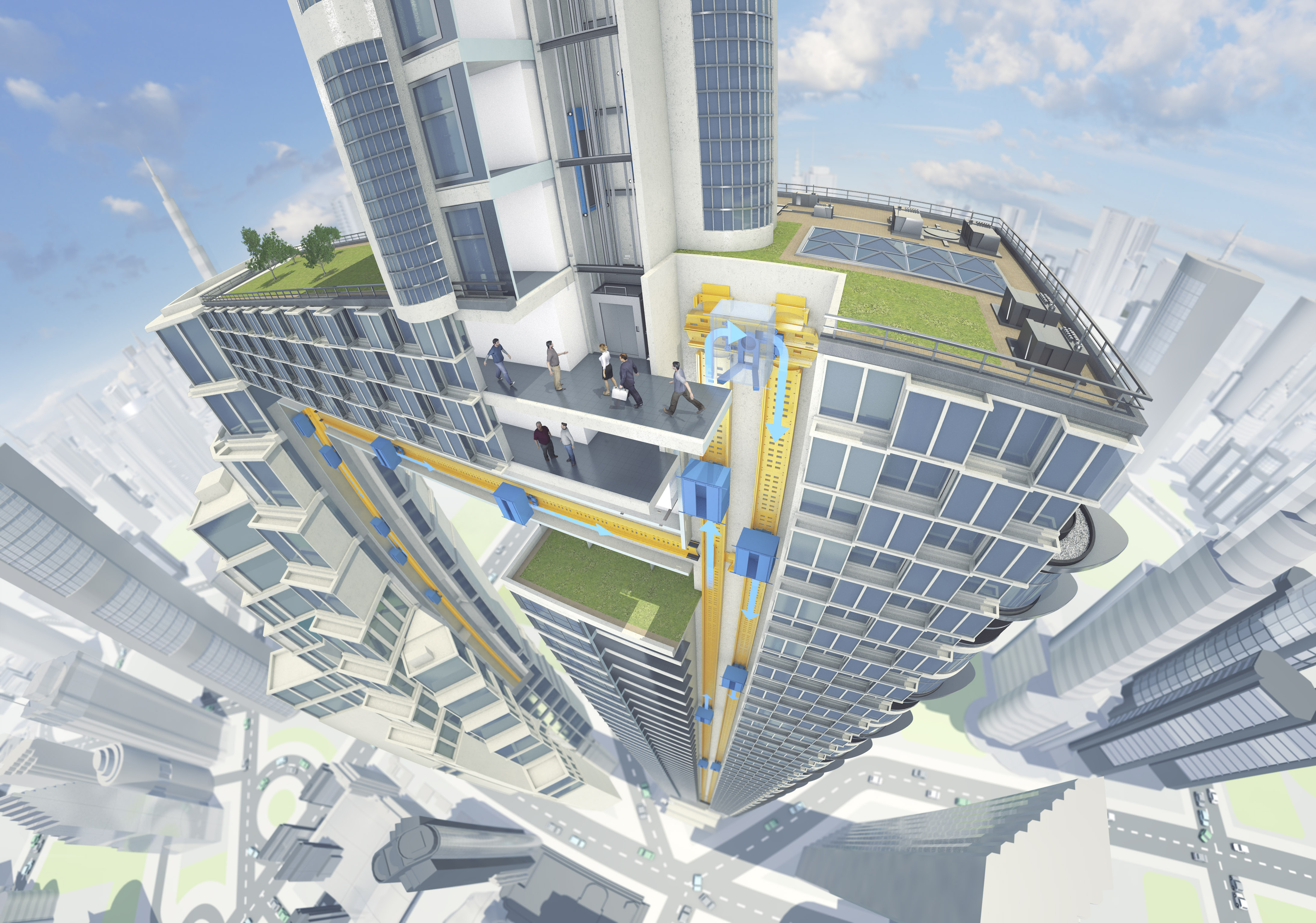 ThyssenKrupp setzt erstmals Linearmotoren an Aufzugskabinen ein und überträgt Nahverkehrskonzepte mit Haupt- und Zubringerstrecken auf den Personentransport innerhalb von Gebäuden. Die MULTI-Aufzugstechnologie erhöht Beförderungskapazitäten und Effizienz bei gleichzeitiger Senkung des Platzbedarfs.