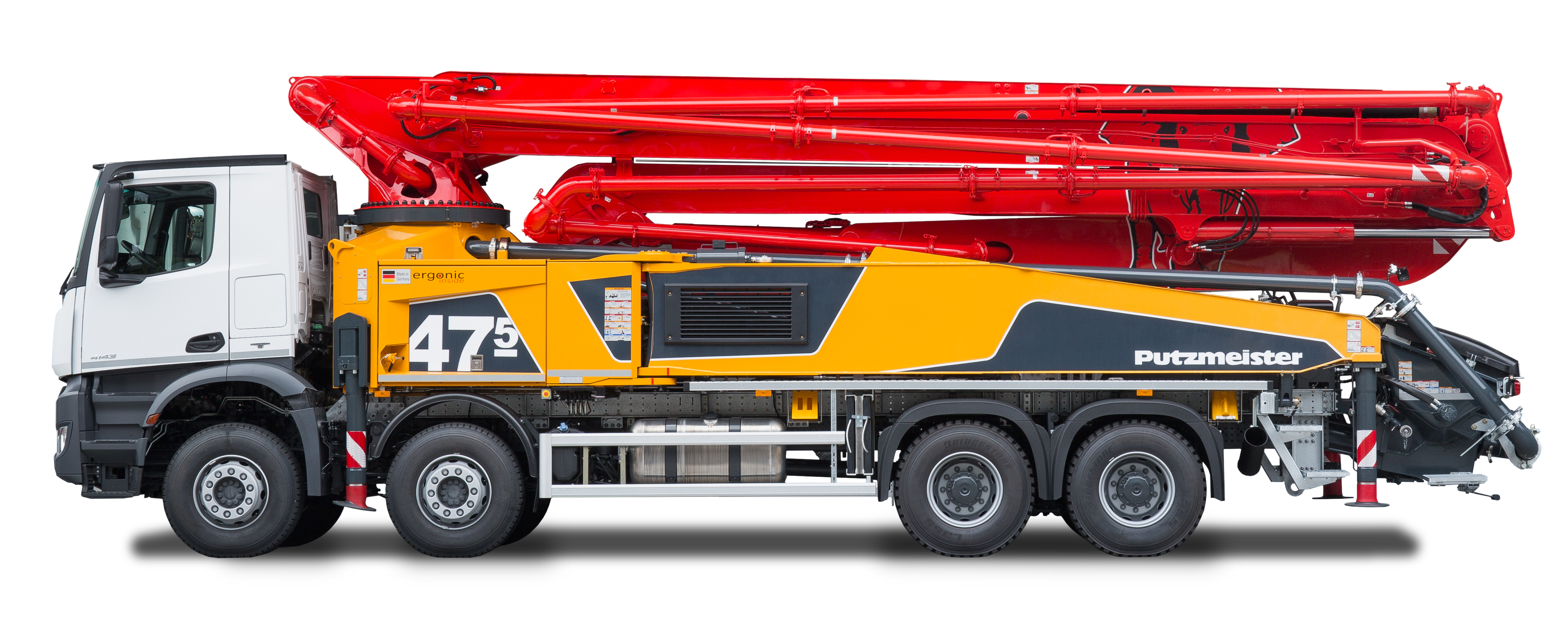 Mit dem neuen Design der 47-5 setzt Putzmeister Maßstäbe in punkto Gewicht, Bedienung, Sicherheit und Wirtschaftlichkeit der Betonpumpe. Sie wiegt weniger als 32 Tonnen inklusive ausreichende Reserven für Zuladung, Wasser, Kraftstoff und weitere Betriebsstoffe.